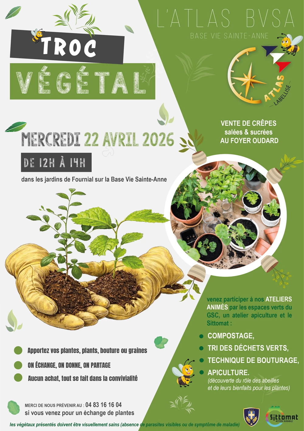 L’association participera au Troc végétal à l’Atlas Base vie Saint-Anne. Crêpes salées et sucrées au foyer Oudard.